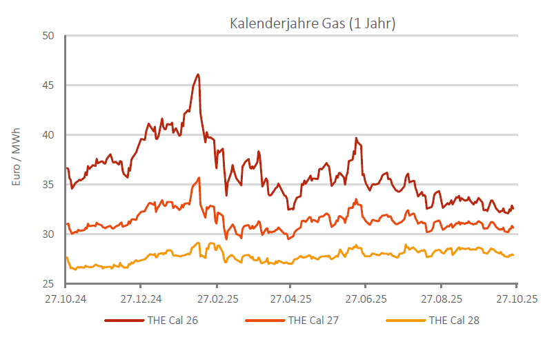 Neben den bereits genannten Faktoren sorgen die Aussicht auf schnelle Friedensverhandlungen im Ukraine- Konflikt sowie dann möglicherweise wegfallende Sanktionen gegenüber Russland für optimistischere Versorgungserwartungen. Das Cal 26 THE verlor im Wochenvergleich 3,7 % auf 39,76 €/MWh. Bei den Folgekontrakten waren jedoch Anstiege zu verzeichnen. Das Cal 27 THE gewann 0,7 % auf 32,88 €/MWh hinzu. Beim Cal 28 THE fiel der Zugewinn mit 4,4 % auf 29,11 €/MWh besonders deutlich aus.