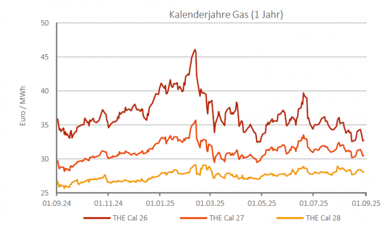Auf der Terminkurve ging es in der vergangenen Woche abwärts. Insbesondere eine eigentlich sanktionierte LNG-Lieferung aus Russland nach China weckt Hoffnungen auf ein verbessertes LNG Angebot. Eine Reaktion der USA steht aktuell aus. Das Cal 26 THE gab im Wochenvergleich 3,9 % auf 32,78 €/MWh ab. Auch die Folgejahre zeigten Abgaben. Das Cal 27 THE verlor 2,4 % auf 30,51 €/MWh und das Cal 28 THE 1,0 % auf 28,07 €/MWh.