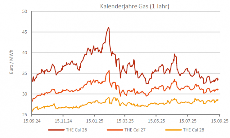 Auf der Terminkurve ging es mit der Möglichkeit neuer Sanktionen gegenüber Russland und dem unwahrscheinlicher werdenden Fortschritt in etwaigen Friedensverhandlungen aufwärts. Die Fortsetzung der Lieferungen aus dem sanktionierten LNG Terminal Arctic 2 sorgte einerseits für eine verbesserte Angebotslage, erhöht aber auch den Druck für weitere Sanktionen auf die Annahme russischer Öl-und Gasmengen. Am ausgeprägtesten war die Aufwärtsbewegung im kurzfristigen Bereich. Das Cal 26 THE gewann im Wochenvergleich 2,0 % auf 33,64 €/MWh hinzu. Die Folgejahre zeigten sich ebenfalls fester. Das Cal 27 THE legte 1,6 % auf 31,15 €/MWh zu und das Cal 28 THE 2,5 % auf 28,60 €/MWh.