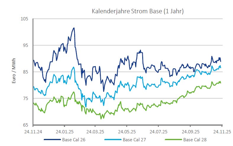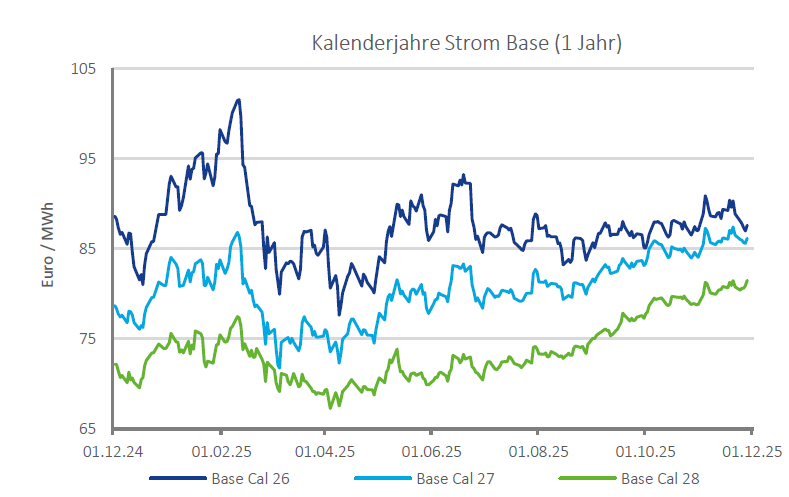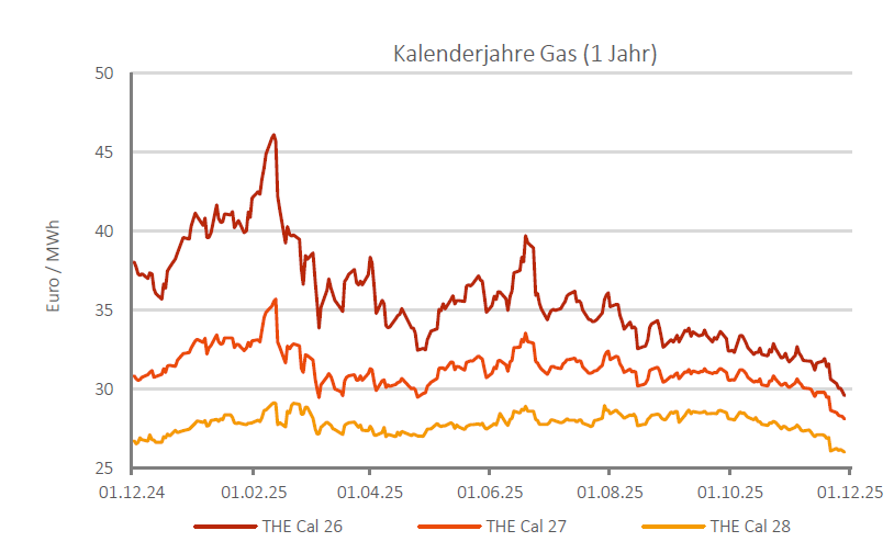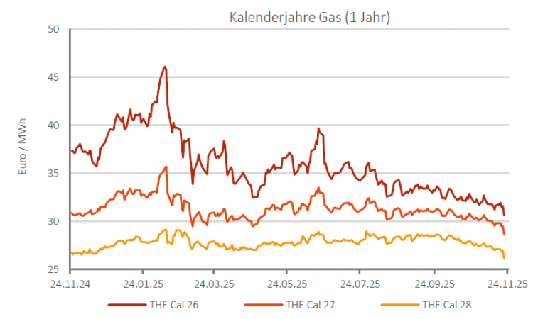 Die Terminkurve verzeichnete in der abgelaufenen Woche ebenfalls deutliche Verluste. Die aktuelle Kältewelle soll zu Beginn dieser Woche enden und somit die Heiznachfrage etwas reduzieren. Die Angebotslage bezüglich LNG zeigte sich weiterhin ausreichend hoch. Neben den milderen Temperaturprognosen sorgten auch Gespräche über einen Frieden in der Ukraine für Abgaben am Markt. Das Cal 26 THE verzeichnete insgesamt einen Wochenverlust von 3,3 % und schloss bei einem Settlement-Preis von 30,63 €/MWh. Einen noch stärkeren Rückgang zeigte das Cal 27 THE, welches 3,8 % auf 28,66 €/MWh abgab. Beim Cal 28 THE fiel die Veränderung zur Vorwoche mit einem Minus von 3,7 % ähnlich aus. Der Settlement lag zum Ende der Woche bei 26,10 €/MWh.