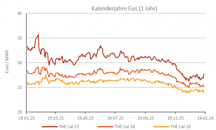 Synchron zu den Spotpreisen entwickelte sich auch die Terminkurve. Insbesondere das kurze Ende war von deutlichen Zugewinnen geprägt. Das Cal 27 THE stieg im Wochenvergleich um 4,5 % auf 27,78 €/MWh hinzu. In den Folgejahren zeigten sich gemischte Entwicklungen. Während das Cal 28 THE am Freitag 0,8 % stärker bei 25,41 €/MWh aus dem Handel ging, schloss das Cal 29 THE 0,2 % schwächer bei 24,09 €/MWh.