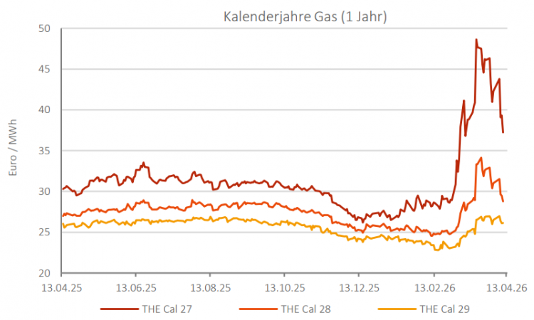 Auf der Terminkurve ging es mit der Verkündung einer Waffenruhe sowie den geplanten Gesprächen fürs Wochenende deutlich abwärts. Das Cal 27 THE gab im Wochenvergleich 15,0 % auf 37,24 €/MWh ab. Die beiden folgenden Jahre zeigten eine schwächere Entwicklung. Das Cal 28 THE verlor noch 8,6 % auf 28,79 €/MWh, das Cal 29 THE gab hingegen nur noch 3,1 % auf 26,14 €/MWh ab.