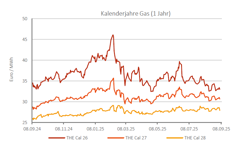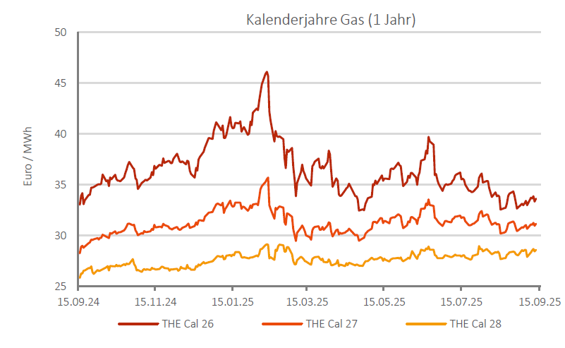 Auf der Terminkurve ging es ebenfalls bis Mitte vergangener Woche abwärts, ehe sich auch hier die Preise stabilisierten und in Seitwärtsbewegungen verfielen. Das Cal 24 THE verlor im Wochenvergleich 11,1 % auf 63,02 €/MWh. Das Cal 25 THE verzeichnete ebenfalls Abgaben und schloss um 4,6 % schwächer bei 52,03 €/MWh. Das Cal 26 gab 5,3 % ab und schloss bei 38,91 €/MWh.