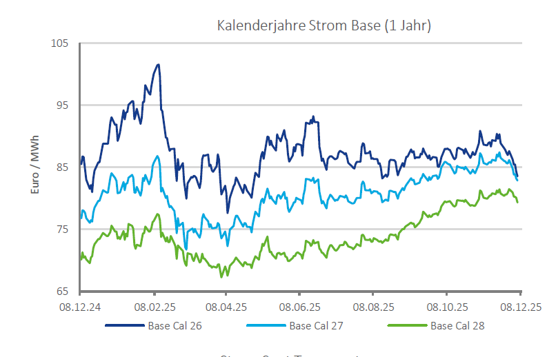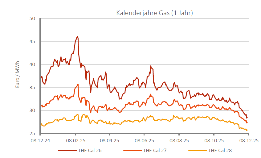 Auf der Gaskurve waren in der vergangenen Woche weitere Abgaben zu beobachten. Das Frontjahr verlor 3,3 % und schloss am Freitag bei 29,42 €/MWh. Bei den Folgejahren waren unterschiedliche Entwicklungen zu beobachten. Während das Cal 26 THE 1,2 % auf 28,37 €/MWh verlor, verzeichnete das Cal 27 THE einen Anstieg von 1,1 % auf 27,63 €/MWh. Mit den anhaltend milden Temperaturen sind wir heute nochmals tiefer in den Handel gestartet. Der Day Ahead Kontrakt wird zurzeit deutlich unter der Marke von 25 €/MWh gehandelt und auch die Terminkurve schließt sich den bearishen Vorgaben an.